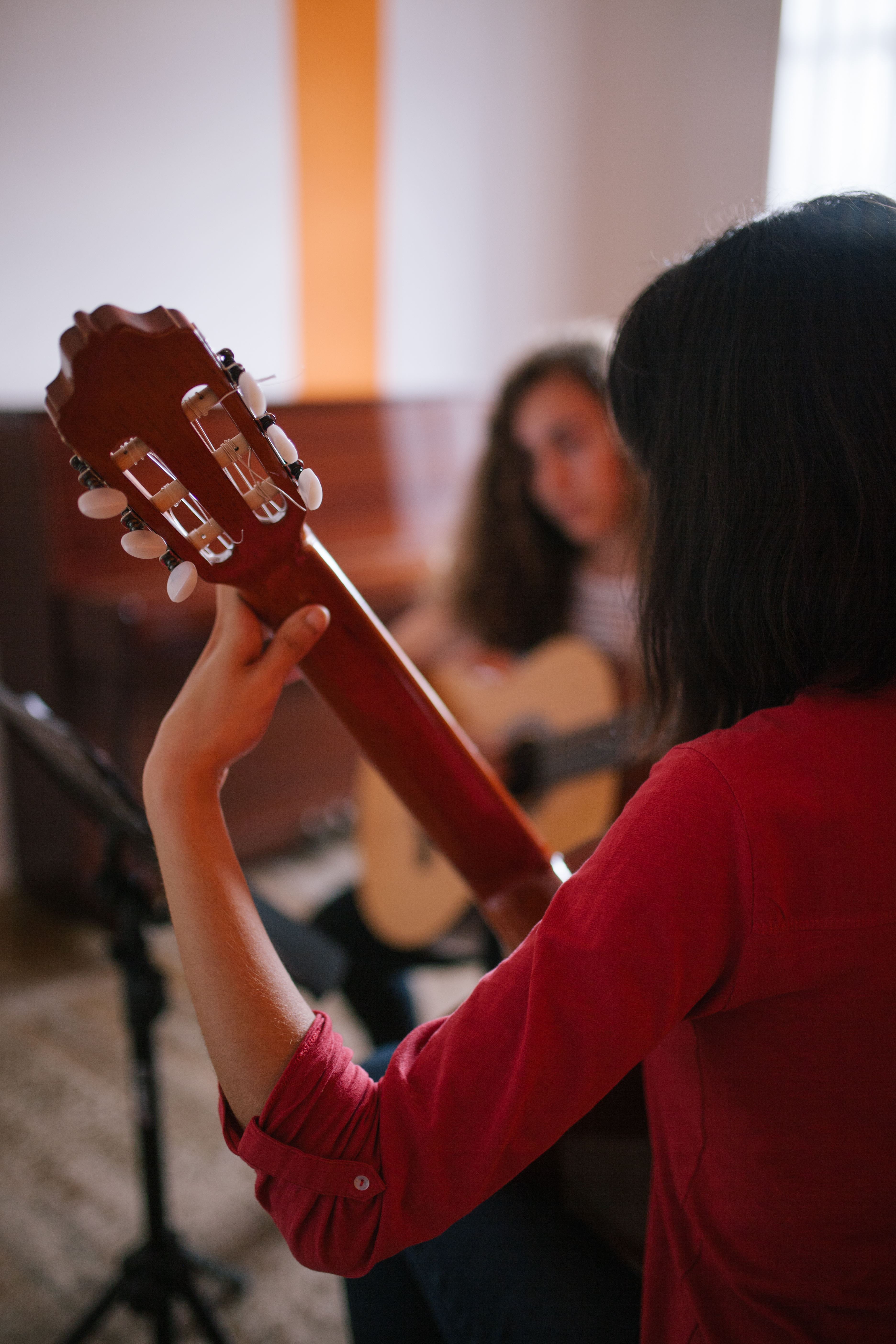 Der Gitarrenunterricht beginnt mit dem Melodiespiel nach Noten oder mit Akkordgriffen nach Griffbildern.